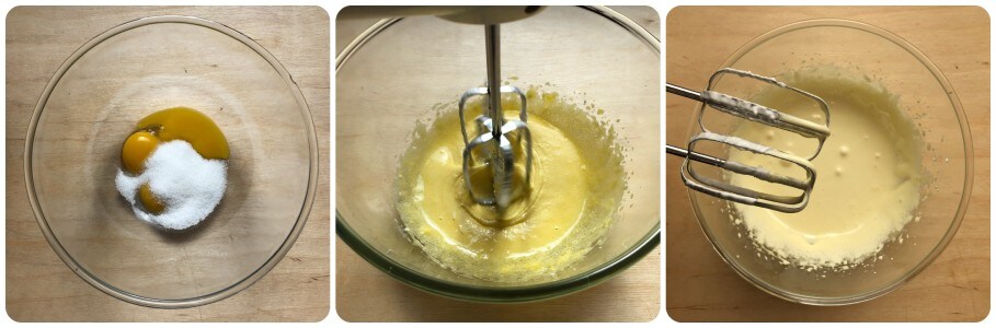 Voeg de resterende 50 g suiker toe aan de eidooiers en klop deze ook met de kloppers tot ze licht en schuimig zijn.