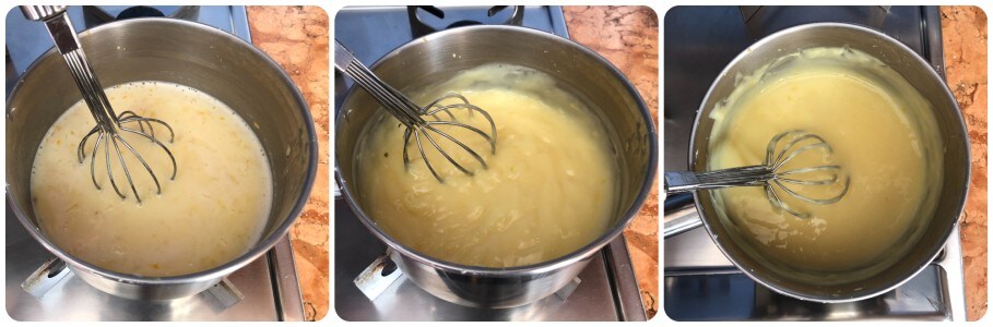 Giet de melk in de steelpan, voeg dan de schil van een citroen en 30 ml sap (dat van ongeveer een halve citroen) toe en meng.