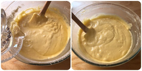 Begin op dit punt geleidelijk de bloem toe te voegen door deze samen met het bakpoeder te zeven met een fijne zeef. Meng het met een spatel door het beslag.