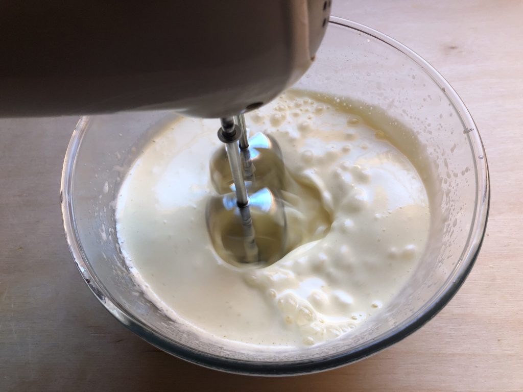 • Voeg de melk, de olie en het citroensap toe en klop opnieuw met de mixer.