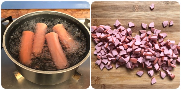 Breng in een steelpan ongezouten water aan de kook. Als het kookt, doe je de worstjes erin en kook ze vijf minuten. Giet ze vervolgens af en snijd ze in stukjes. Voor het gemak heb ik ze voor het koken doormidden gesneden.