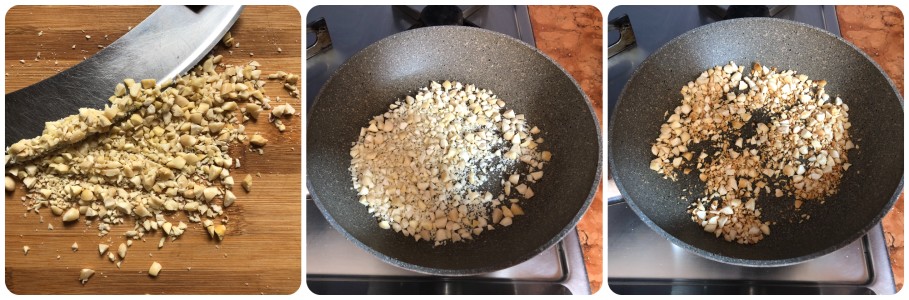 Hak de amandelen grof met een hakmes. Rooster ze vervolgens in een kleine koekenpan zonder enige toevoeging. Zodra ze goudbruin zijn, haal je ze uit de pan en zet je ze apart. Meng ze vaak.