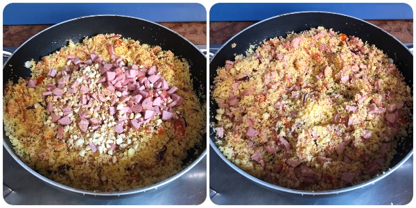 Doe de couscous in de pan met de ui en tomaatjes en meng goed.
