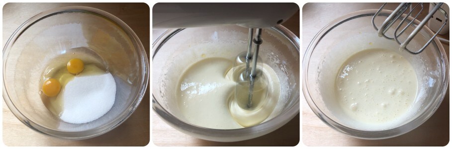 Breek de eieren in een grote kom, voeg de suiker toe en klop lang met de elektrische kloppers tot je een luchtig en schuimig mengsel krijgt.