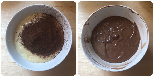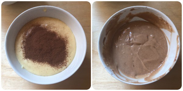 Voeg de ongezoete cacao toe aan de eerste kom en meng tot je een mooi gelijkmatige kleur krijgt.