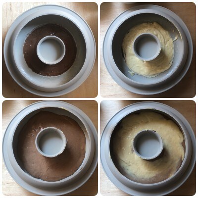 Giet de drie mengsels nu in een tulbandvorm met een diameter van 22 cm, waarbij je ze meerdere keren afwisselt zonder ze ooit te mengen. De vorm moet bekleed zijn met bakpapier of ingesmeerd worden met bakvormlosmiddel (recept HIER). Ik gebruikte er een van siliconen en smeerde deze alleen in met boter.