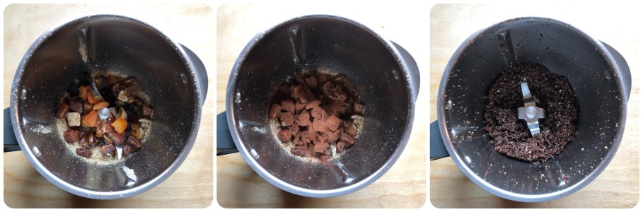 Voeg vervolgens het zachte fruit in stukjes en het ongezoete cacaopoeder toe. Maal tot een mengsel dat tussen de vingers gemakkelijk samenpakt. Ik heb op gevoel gewerkt en gemalen op snelheid 6, waarbij ik het mengsel elke 10 seconden controleerde. Indien nodig kun je een paar theelepels heet water toevoegen om het mengsel te binden. Het is echter belangrijk dit geleidelijk te doen. Het is niet nodig suiker of honing toe te voegen. In dit recept is de zoetheid al ruim voldoende en anders worden de balletjes te zoet.