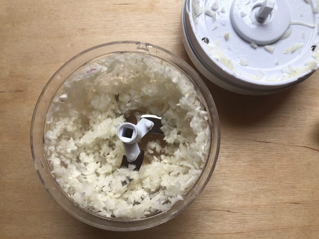• Pel de ui en hak deze fijn. Ik gebruikte een handmatige koordtrimmer die ik erg handig vind. Als u deze wilt kopen, kunt u deze vinden door HIER te klikken.