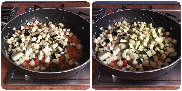 • Voeg dan de aubergine en courgettes toe en bak nog vijf minuten.