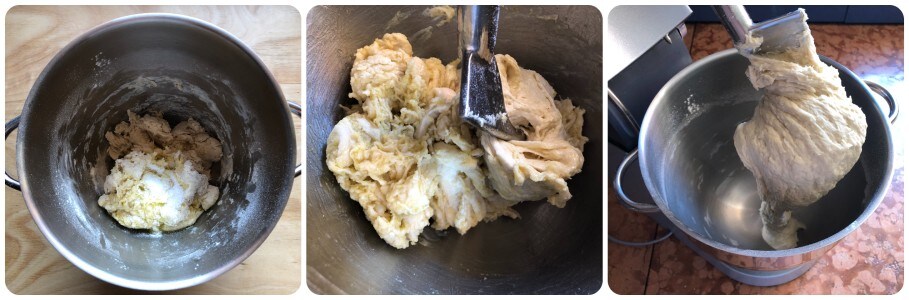 Voeg vervolgens 300 ml lauwwarm water toe en begin te kneden met de deeghaak.