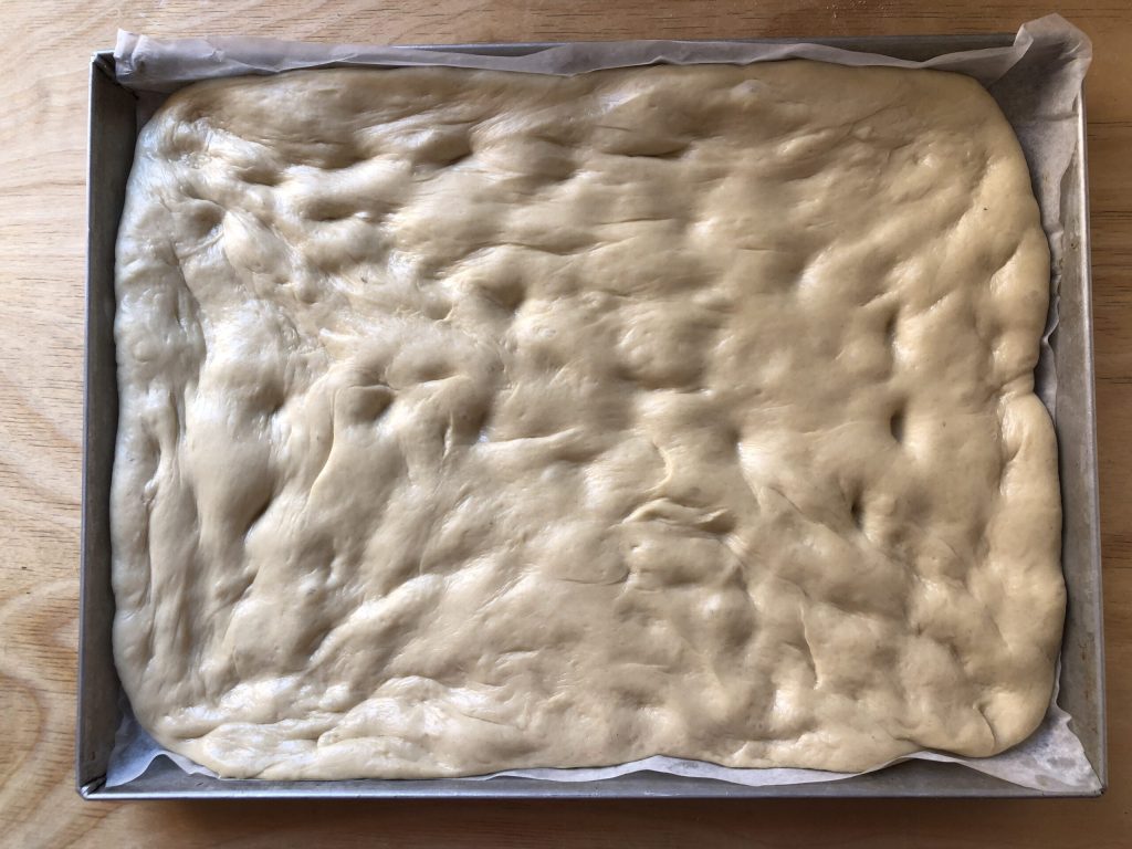 Wanneer het deeg gerezen is, druk het dan met de handen uit in een met bakpapier beklede bakplaat en laat het nog een half uur rijzen.
