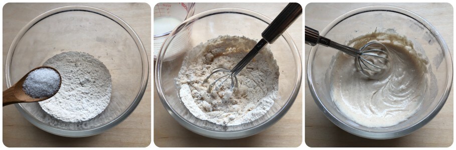 Doe het meel in een kom samen met het zout. Voeg vervolgens geleidelijk de melk toe en roer met een kleine handgarde.