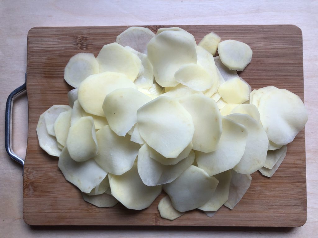 Schil de aardappelen, was ze, droog ze af met keukenpapier en snijd ze in dunne plakjes met een mandoline.