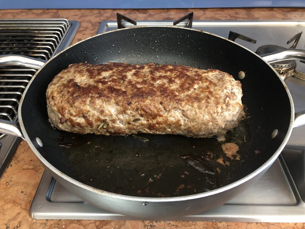 Leg het gehaktbrood erin en bak het aan alle kanten goudbruin door het voorzichtig met twee spatels te draaien. Giet er dan de witte wijn bij en laat deze lichtjes verdampen.