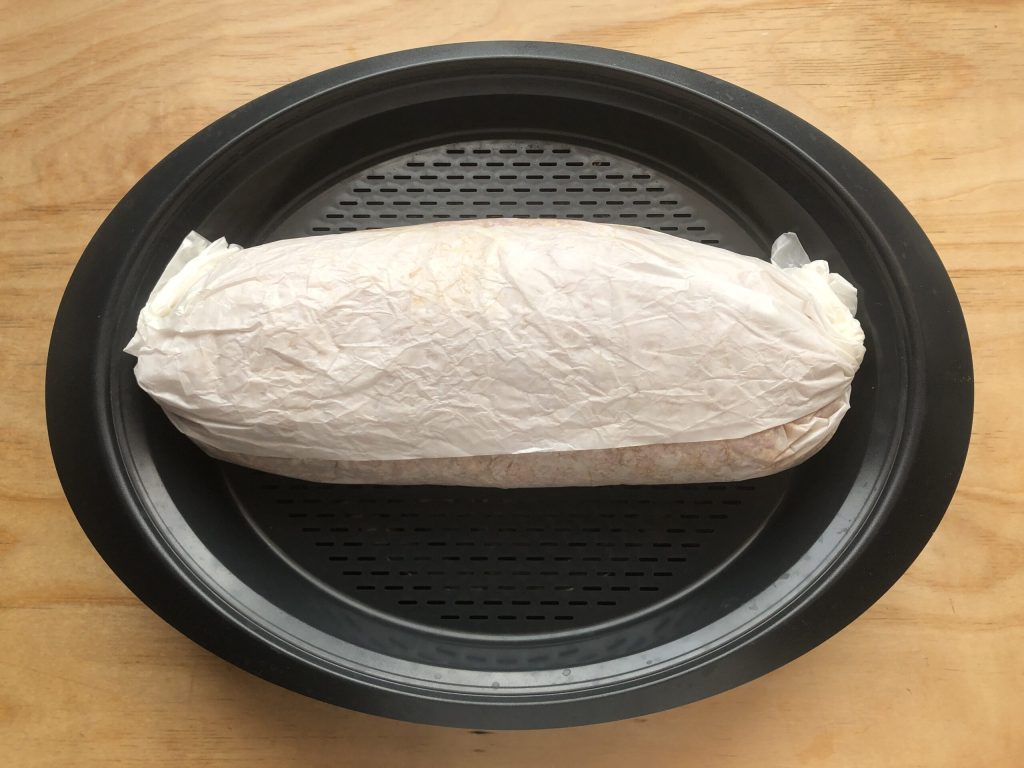 Breng het verkregen mengsel over op een vel bakpapier dat eerder nat en uitgeknepen is en geef het de vorm van een gehaktbrood.