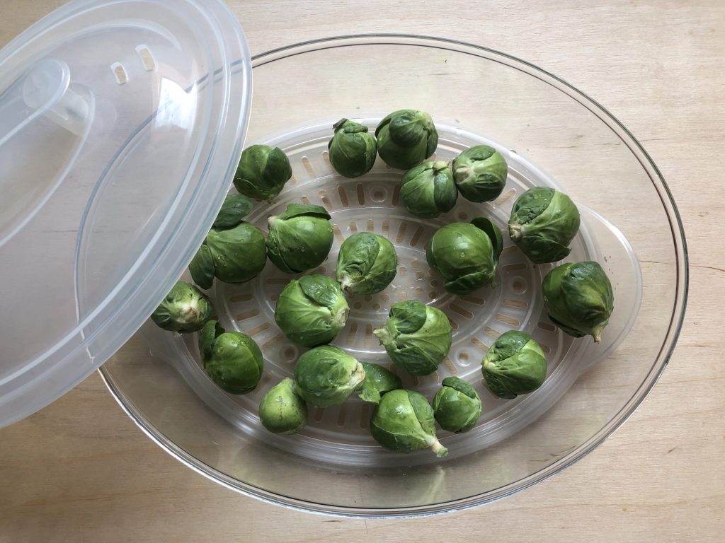 Als de spruitjes gaar zijn, haal ze dan uit de stoomkoker, laat ze afkoelen en snijd ze doormidden. Verzamel ze ondertussen in een kom.