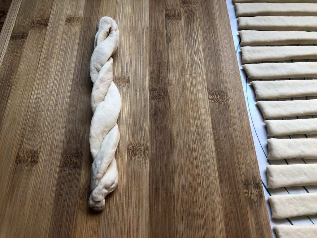 Leg de gevlochten grissini vervolgens op een met bakpapier beklede bakplaat en bestrijk ze met olie. Je hebt twee bakplaten nodig en moet dus twee keer bakken.