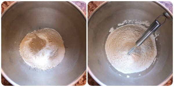 Doe de bloem in de kom van de keukenmachine, voeg de gist en suiker toe en meng met een kleine handgarde.