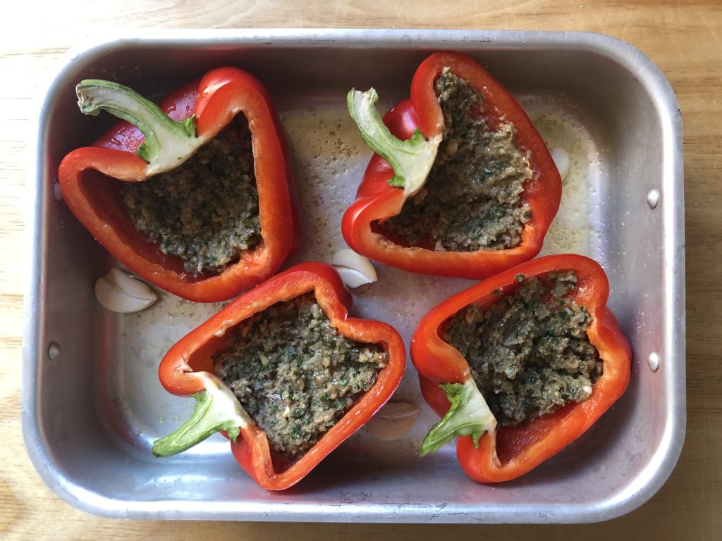 Giet ten slotte een paar eetlepels water op de bodem van de schaal en besprenkel de gevulde paprika’s met een beetje olie.