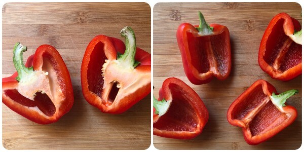Snijd de paprika’s doormidden en laat de steeltjes eraan zitten. Verwijder vervolgens alle zaadjes en de witte binnenste draden. Was ze en droog ze door ze met keukenpapier te deppen.
