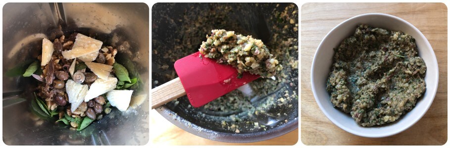 Pel de teentjes knoflook, snijd ze doormidden, verwijder het middengedeelte en leg ze op de bodem van de schaal.Doe de gewassen en gedroogde basilicumblaadjes, de walnoten, de ansjovisfilets, de kappertjes, de olijven, de kaas in stukjes, 20 ml olie, een snufje zout en een draai van de zwarte pepermolen in een mixer en mix tot een vrij grove massa. Doe het in een kleine kom.