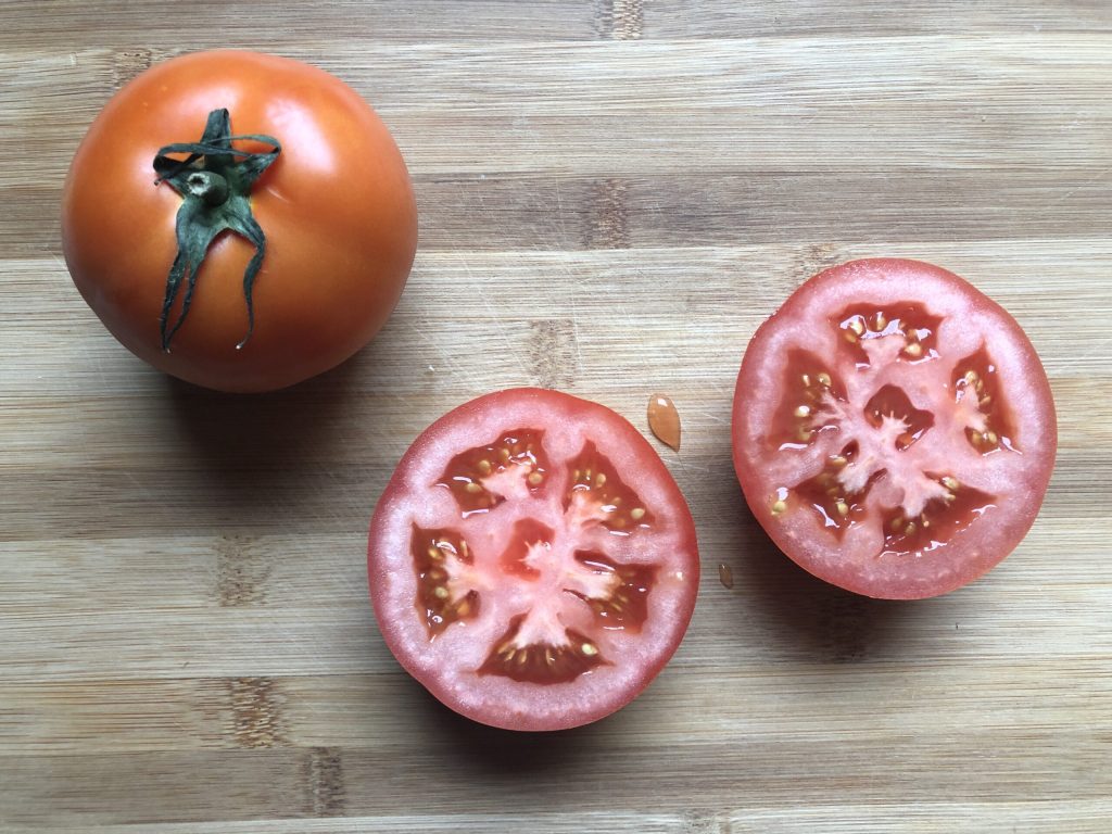 Was de tomaten, droog ze af met keukenpapier, verwijder de steel en snijd ze doormidden in de breedte.