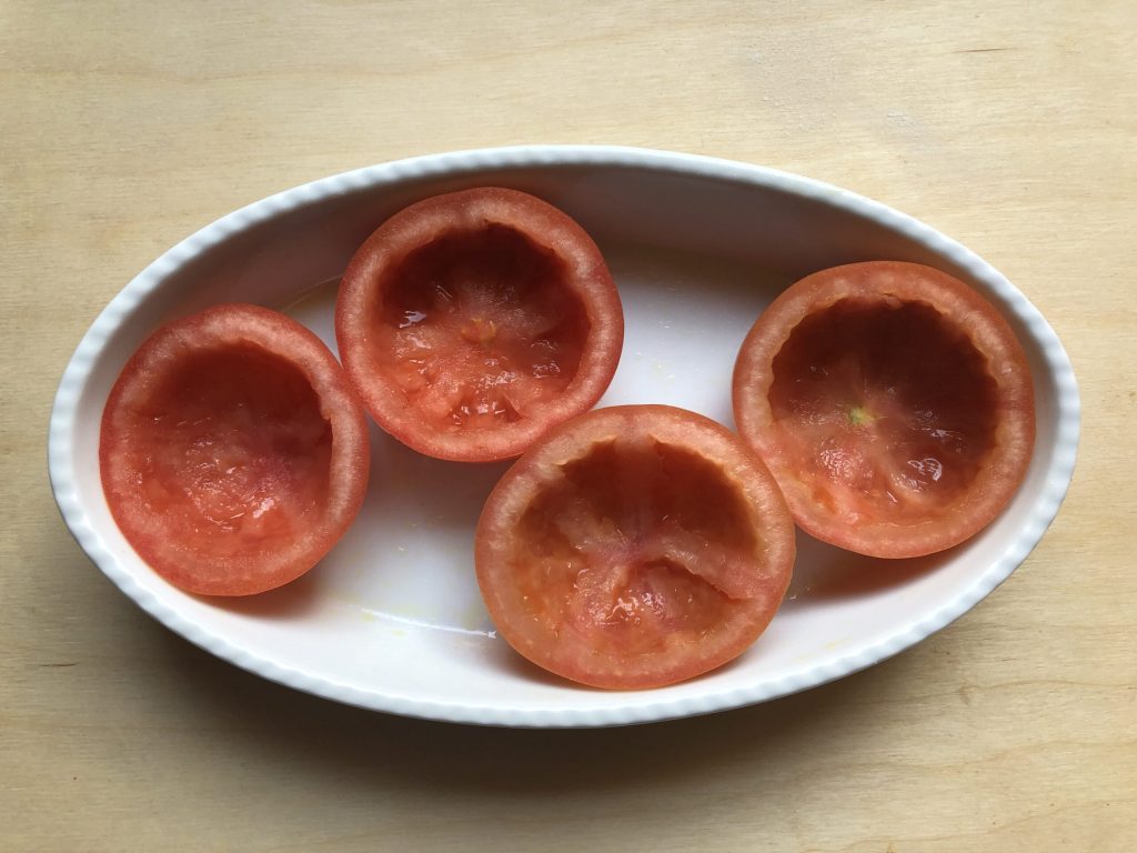 Breek daarna een ei boven elke tomaat en verwijder een deel van het eiwit als het te veel is. Je moet proberen de dooier heel te houden.