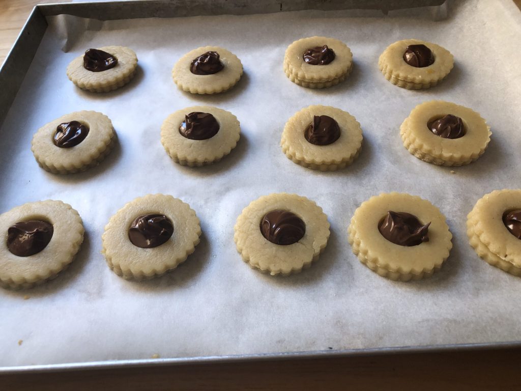 Leg de bodems op een met bakpapier beklede bakplaat. Plaats een hoopje hazelnootcrème (of andere vulling) in het midden en sluit af met het koekje met een gat.