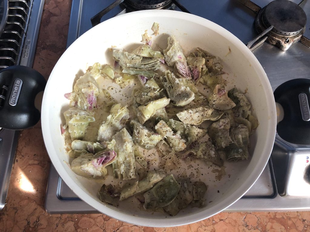 • Laat het een paar minuten sissen, voeg dan de nog bevroren artisjokharten, 50 ml melk en een paar eetlepels heet water toe.