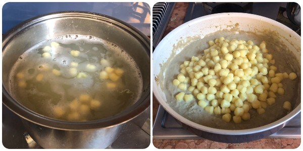 • Kook ondertussen de gnocchetti in ruim gezouten kokend water. Laat ze uitlekken met een schuimspaan zodra ze naar boven komen en breng ze direct over naar de stoofpan met de saus.