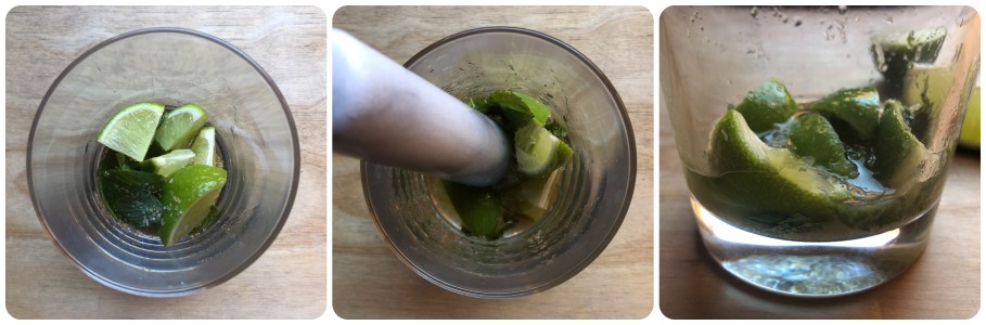 Doe de suiker, muntblaadjes en stukjes limoen in een laag en breed glas en druk ze met een stamper.
