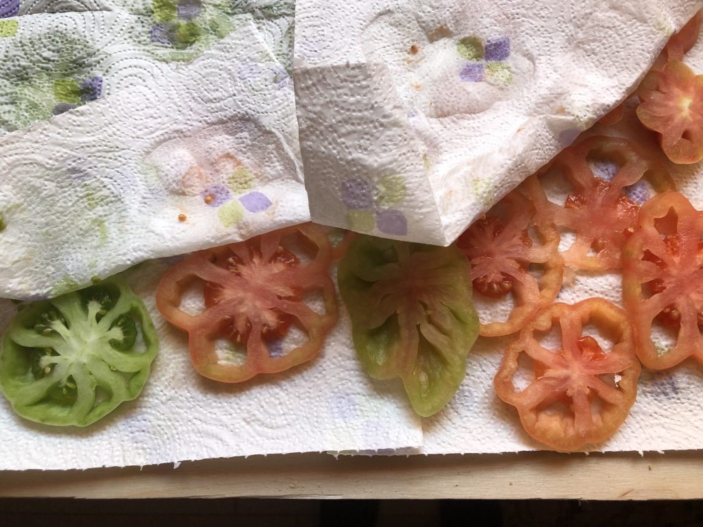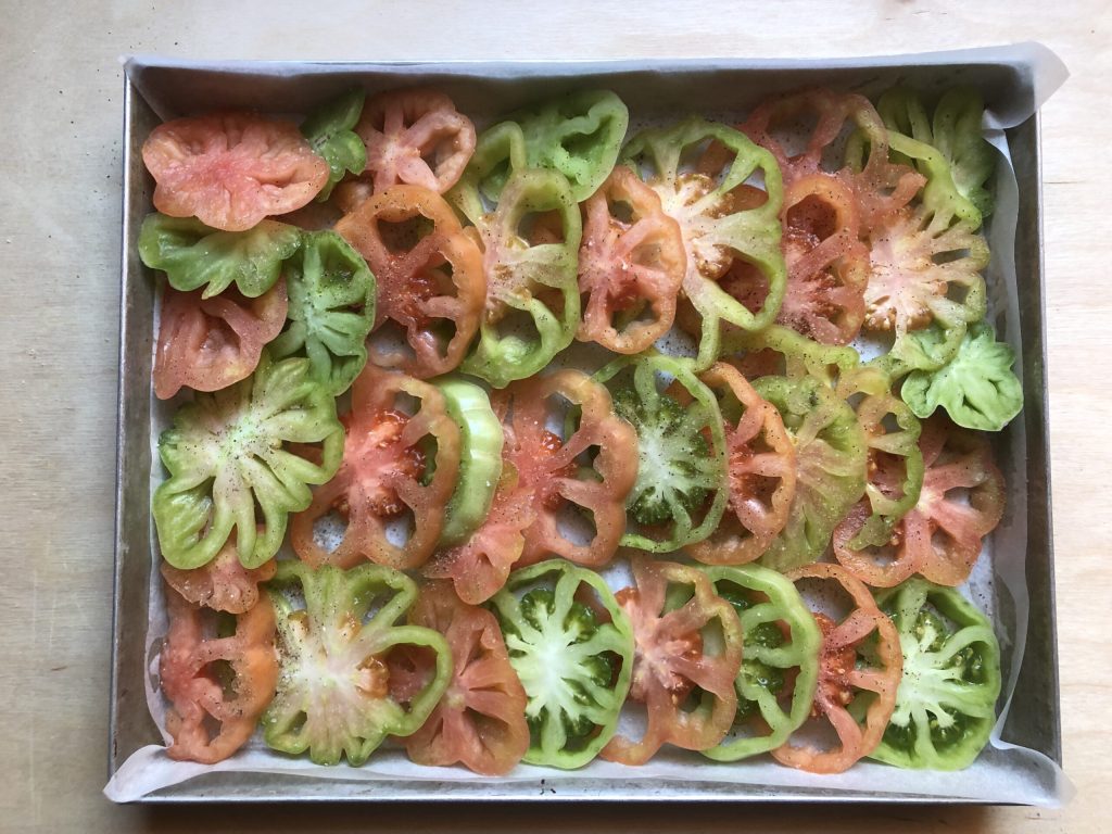 • Bekleed een ovenschaal met bakpapier (de mijne is 33 x 26 cm) en leg de tomatenplakken erop, afwisselend van kleur. Zout en peper naar smaak.
