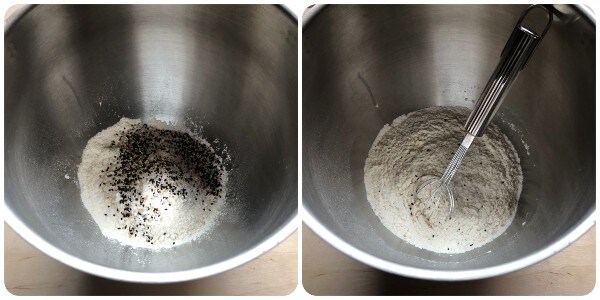 Doe de bloem, de instant gist en de zwarte en witte sesamzaadjes in de kom van de keukenmachine en meng met een kleine handklopper. Als je ze echter wilt kopen, kun je ze vinden door HIER te klikken.