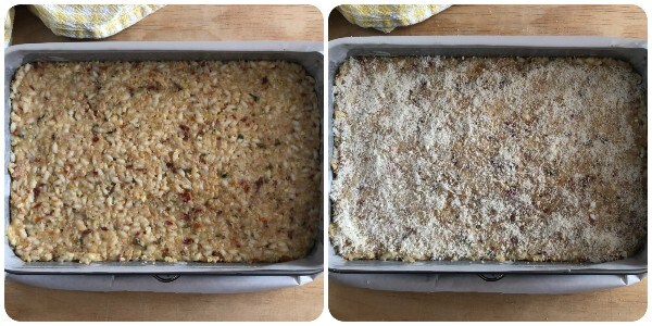Breng het mengsel over in een springvorm en strijk het glad met een spatel, bestrooi dan het hele oppervlak met de resterende geraspte kaas (20 g) : ik gebruikte een rechthoekige cakevorm van 28 x 18 cm, maar als je dat liever hebt, kun je ook een ronde vorm met een diameter van 24/26 cm gebruiken.