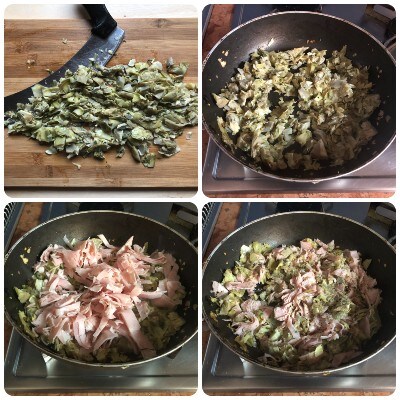 Leg ze op een snijplank en hak ze grof, leg ze daarna weer in de pan op matig vuur en voeg de hamreepjes toe. Zout, peper en meng.