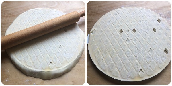 Leg een schijf bladerdeeg bovenop het raster voor taarten. Om meer te weten te komen over dit soort voorwerp en hoe het werkt, verwijs ik je naar een artikel dat ik een tijdje geleden heb geschreven. Je kunt het lezen door HIER te klikken. Je vindt dit raster in huishoudelijke winkels of online door HIER te klikken.