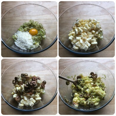 Wanneer de prei lauw is geworden, voeg je het ei, de geraspte kaas, de fontina, de brie en de groene olijven toe. Breng op smaak met zout en peper naar wens en meng zorgvuldig om alle ingrediënten goed te combineren.