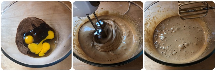 • Voeg de eieren toe aan de suiker en klop lang met de elektrische klopper tot een licht en schuimig mengsel.
