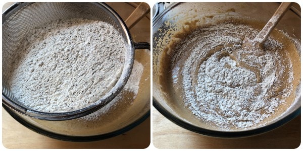 • Zeef nu de overige droge ingrediënten, die eerder met elkaar zijn gemengd, en meng ze met de spatel door het beslag.