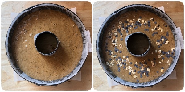 • Haal de chocoladedruppels uit de vriezer, bebloem ze lichtjes en voeg ze samen met de gehakte hazelnoten toe aan het beslag.