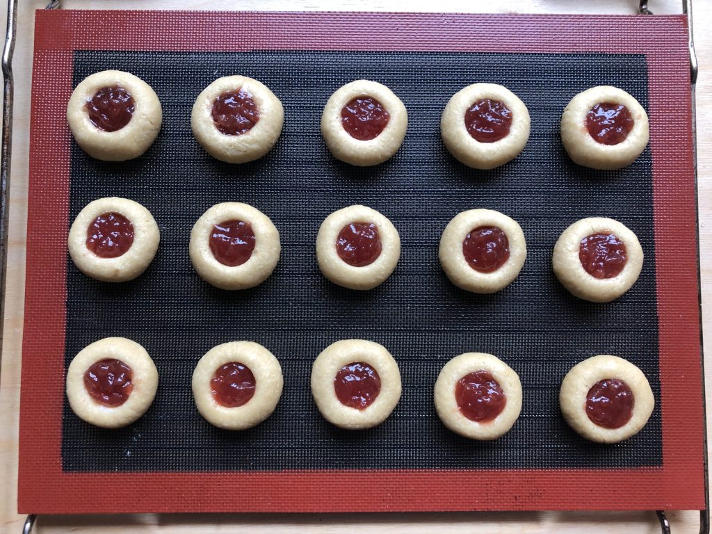 Maak nu in het midden van elk balletje een kuiltje. Ik heb het uiteinde van een stamper gebruikt die ik telkens licht heb bebloemd om te voorkomen dat het deeg zou blijven plakken. Als alternatief kun je de bodem van een klein glaasje gebruiken.