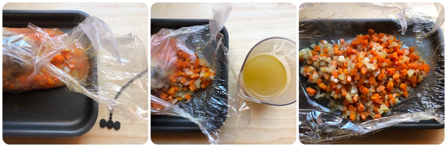 Als de gaartijd voorbij is, haal je de bakplaat uit de oven en open je het pakketje Carta Fata alleen aan één kant. Wees voorzichtig want er komt hete stoom uit. Giet het braadvocht in een glas en filter het om eventuele stukjes groenten tegen te houden.