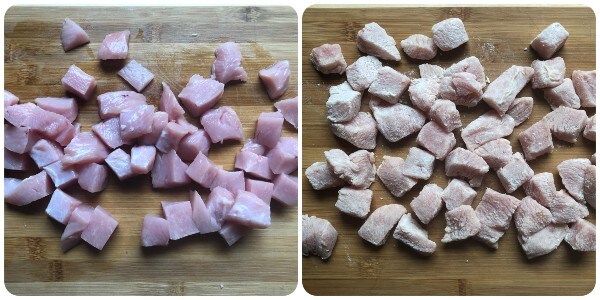 Snijd de kalkoenfilet in gelijkmatige blokjes, haal ze door de bloem en schud ze om overtollige bloem te verwijderen.