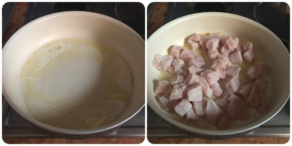 Smelt de boter in een ruime pan, voeg dan de blokjes vlees toe en bak ze enkele minuten op hoog vuur terwijl je ze vaak omschept.