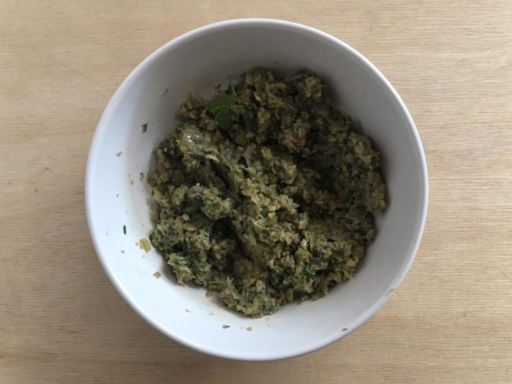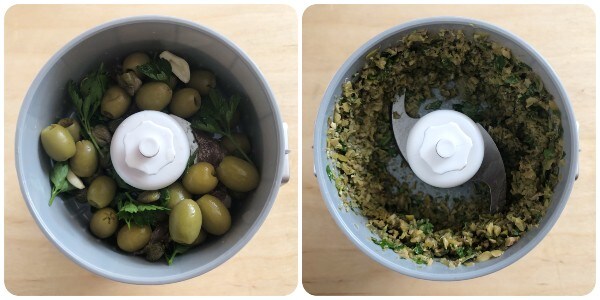 • Doe de peterselie, knoflook, kappers, ansjovisfilets, groene olijven in een hakmolen en hak alles in meerdere keren tot een grove massa: het mag geen crème worden.