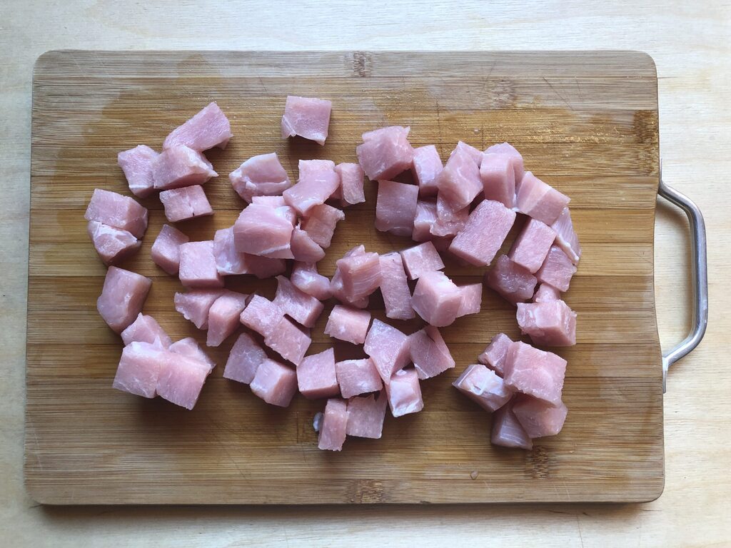 Snijd de kalkoenfilet in middelgrote stukjes, niet te groot en niet te klein.