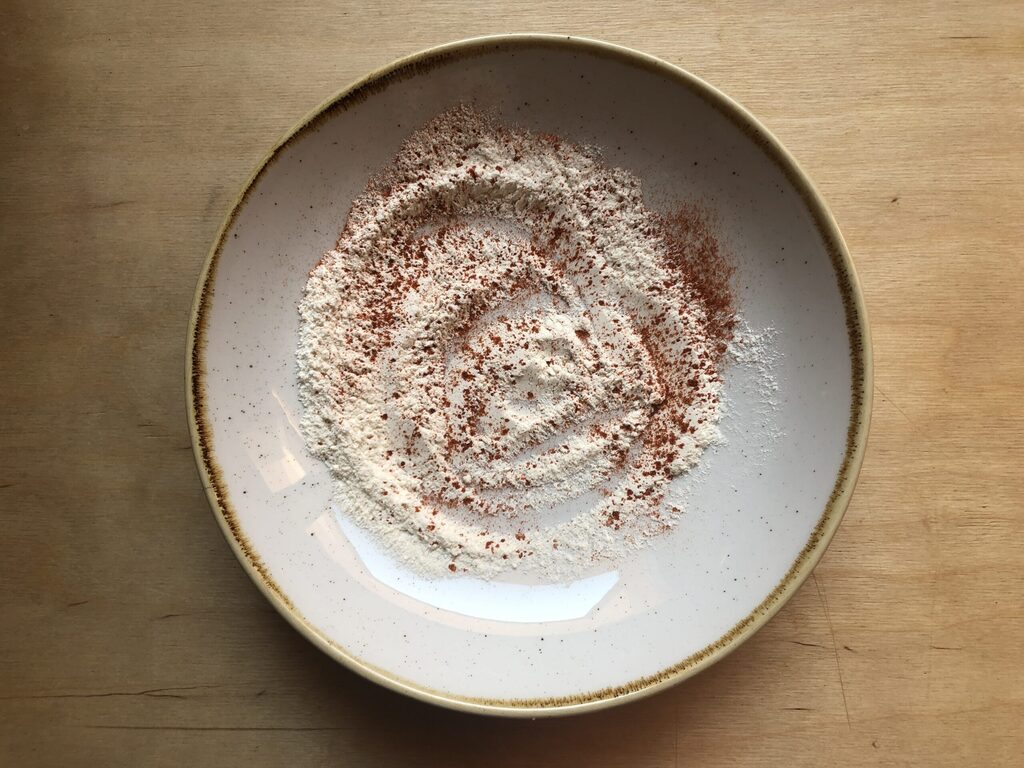 Meng in een bord een beetje bloem en paprikapoeder. Je kunt deze specerij naar smaak doseren. Bereid dit mengsel in meerdere keren naar behoefte.