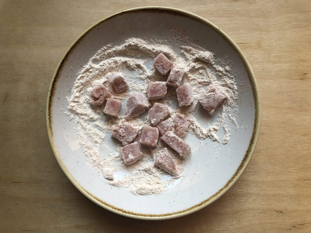 Wentel de stukjes vlees in de bloem totdat ze volledig bedekt zijn.