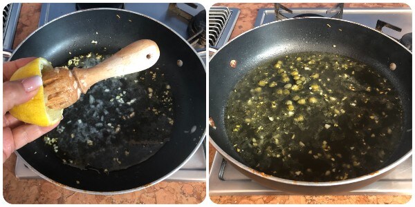 Voeg een scheut olie toe aan dezelfde pan en fruit een fijngesneden teentje knoflook. Als je het niet lekker vindt, kun je het heel laten en aan het eind verwijderen. Laat het even sissen, voeg dan het sap van een halve citroen en de warme bouillon toe. Roer goed door met een lepel om een homogene emulsie te creëren.