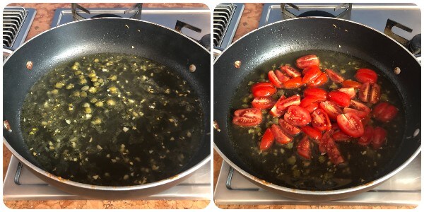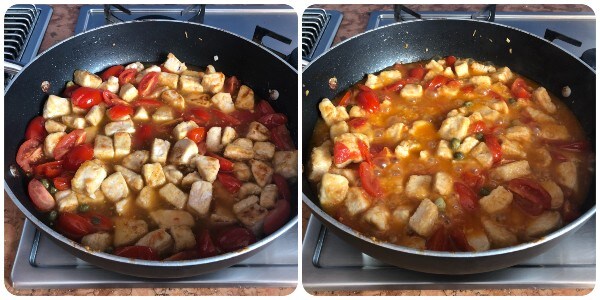 Voeg nu de onder stromend water afgespoelde kappertjes en de eerder in vieren gesneden tomaatjes toe.